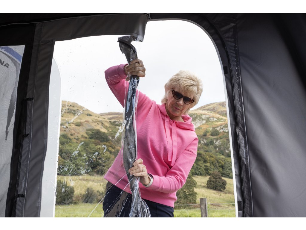 Bezešvé těsnění, flexibilní nastavení. Tato konstrukce zabraňuje průvanu bez tyčí, ale nyní je plně odnímatelná pro ty, kteří dávají přednost tyčím proti průvanu v karavanu. Patent GB2574036. -