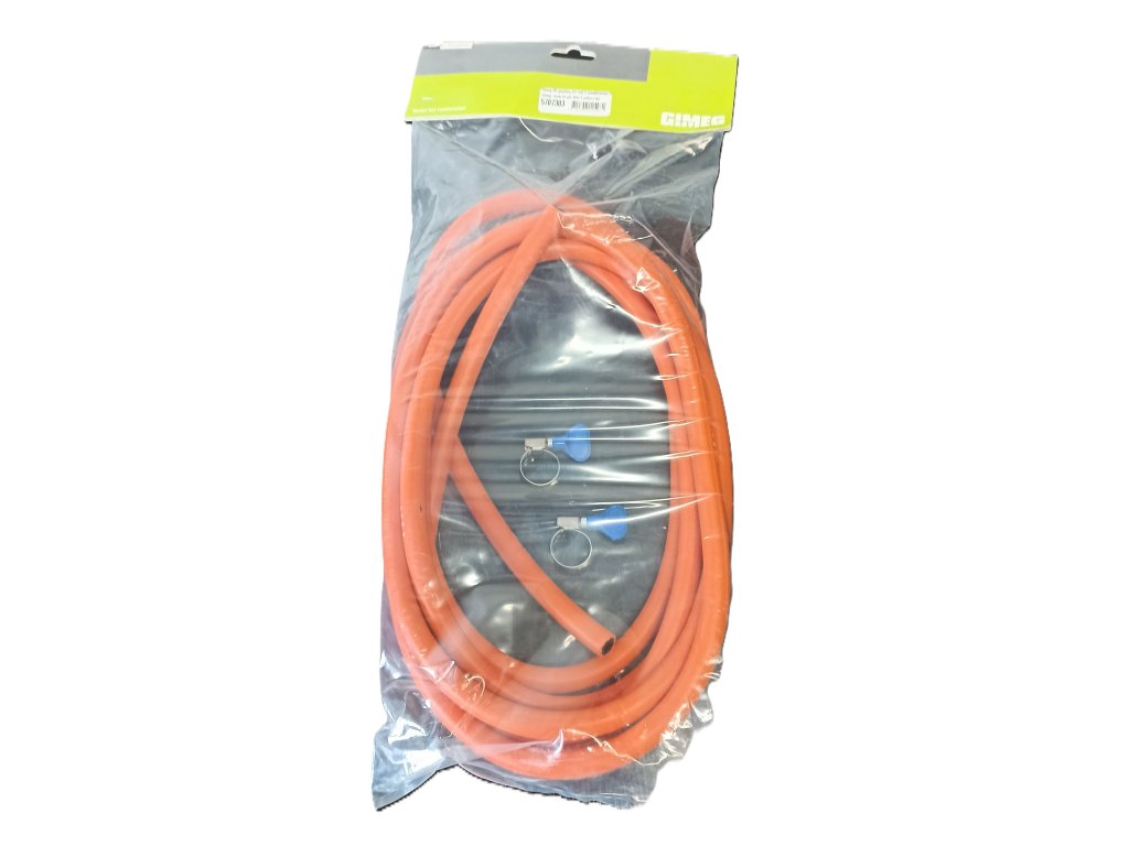 Tato sada od Gimegu se skládá z plynové hadice a dvou hadicových svorek, pomocí kterých ji můžete namontovat. Délka hadice je 5 metrů a je vyrobena z PVC. Tento výrobek odolá pracovnímu tlaku až 20 barů a provozní teplotě -30°C až 80°C. Dvě hadicové spony mají šnekový šroub 11-16 mm. Spony mají křidélka, tak že není potřeba žádného nářadí. Tím se hadice připojí k vašemu zařízení. Plynová hadice má vnitřní průměr 8 mm. Chráněním hadice proti UV záření prodlouží její životnost, stejně jako její instalace do tzv. měkkého ohybu. Plynovou hadici je možné používat i ve venkovním prostředí.
