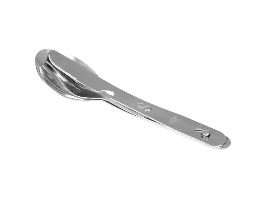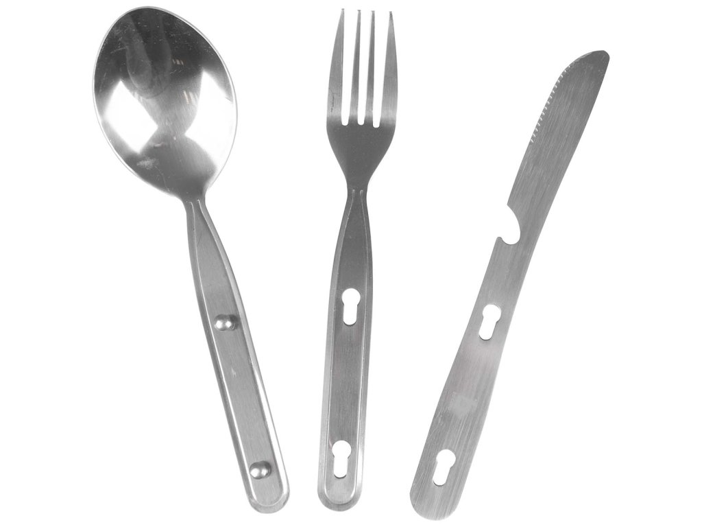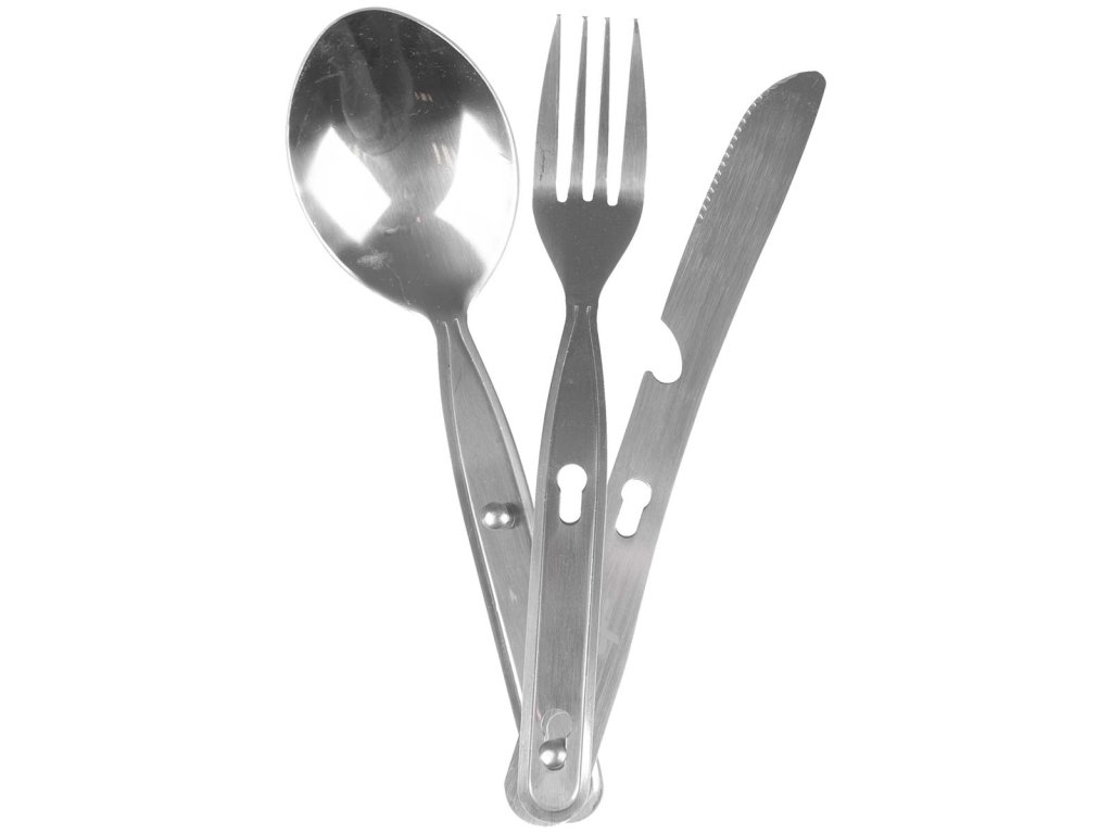 3dílná sada příborů. Ideální sada příborů pro jednu osobu na cesty. Tato sada obsahuje nůž, vidličku a lžíci, přičemž zářez v noži slouží i jako otvírák na lahve.