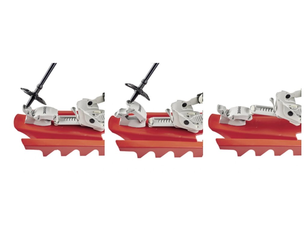 Stisknutím páčky na zadní páčce stačí k přepnutí do zapnuté polohy, aniž byste se museli ohýbat. Inook Inookem dělá jedinečný systém zamykání paty. Zamknutí či odemknutí lze jednoduše udělat holí vestoje, jak známe ze skialpového vázání. Už žádné problémy při překračování spadlých stromů a podobně.