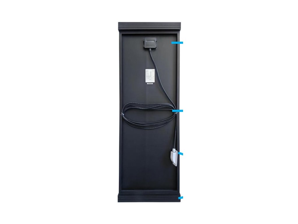 Solární panel s technologií Back contact, je připraven k vyndání z krabice a rovnou jej můžete instalovat na střechu. Na panelu jsou totiž připevněny dva držáky na kratších stranách a na 5m dlouhém přívodním kabelu je navlečená průchodka. Držáky jsou z hliníkového profilu ve tvaru "L" a připevněné k panelu.